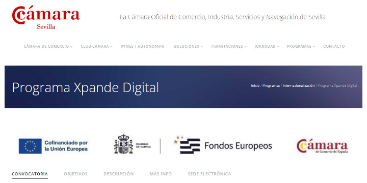 La Cámara Oficial de Comercio, Industria, Servicios y Navegación de Sevilla, junto con la Cámara Oficial de Comercio, Industria, Servicios y Navegación de España, han puesto en marcha el Programa Xpande Digital en el marco del Programa Operativo Plurirregional de España, para el periodo 2021-2027, estando cofinanciado por el Fondo Europeo de Desarrollo Regional (FEDER).
